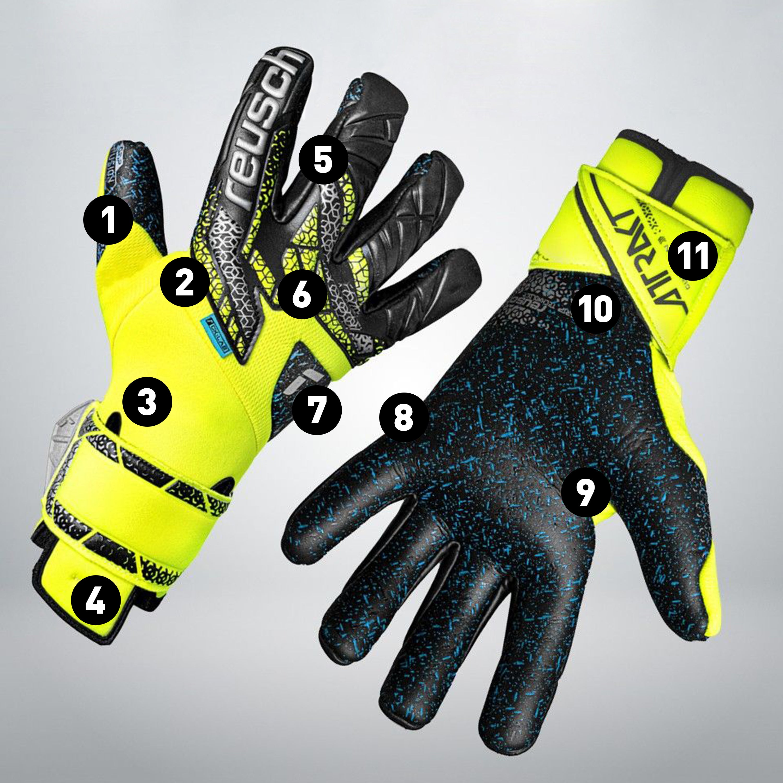 The latex is rolled around the fingertips for a tight fit, best ball control and maximized contact area. An inner-seam construction in the lower finger parts offers a tight, soft, flexible, and ergonomic fit.
