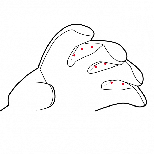 Negative construction with one single gusset and wrapped latex around the index finger and the pinkie for best ball control.